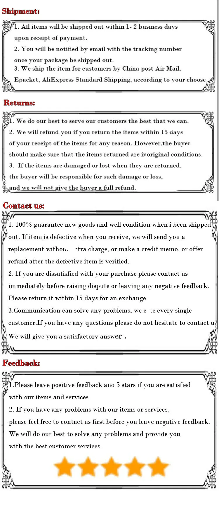• If you did not receive the product within the guaranteed time( 45 days not including 2-5 day processing) you can request a refund or a reshipment.