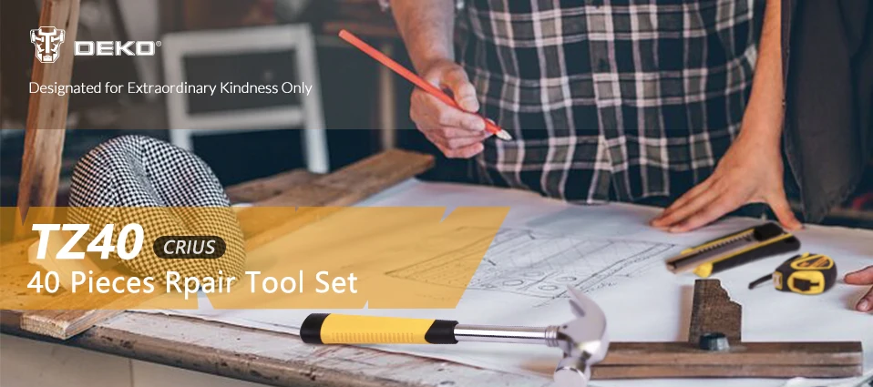 | DEKO 40-Piece Tool Kit is the perfect choice to accomplish your general purpose projects, repairs, and maintenance at home, garage, office, shop or dormitory, no matter you are a homeowner, a business owner, a college student or a DIYer. It contains all the basic but necessary tools you will need around your home to assemble furniture, install back yard and patio essentials, hang picture frame, fix simple plumbing issues, repair your bicycle, and a lot more. All the tools in this kit are made from high strength materials, precisely manufactured and heat treated to provide durability and extended tool life. | ||