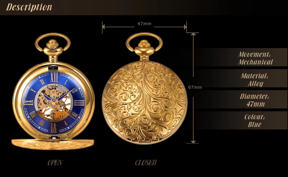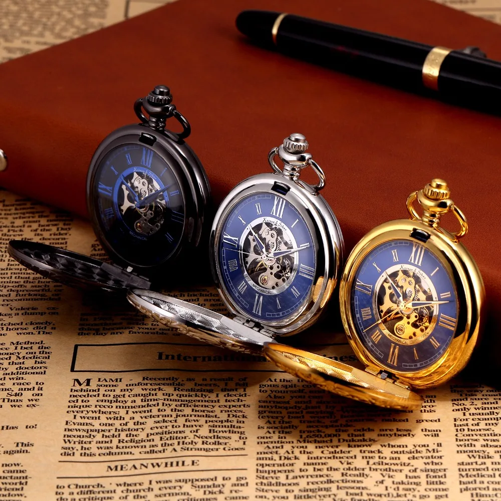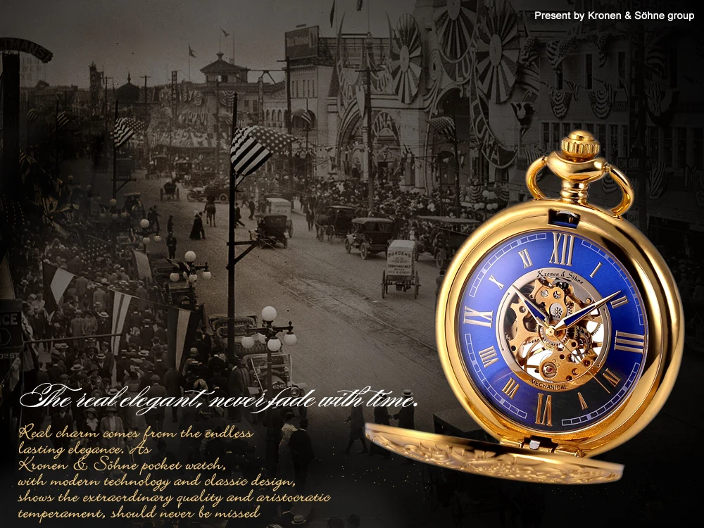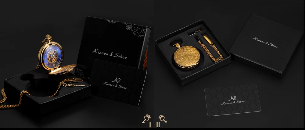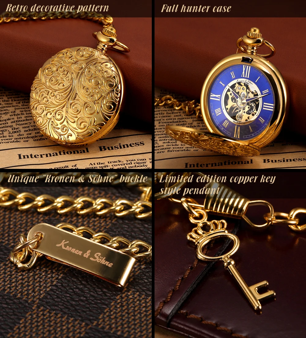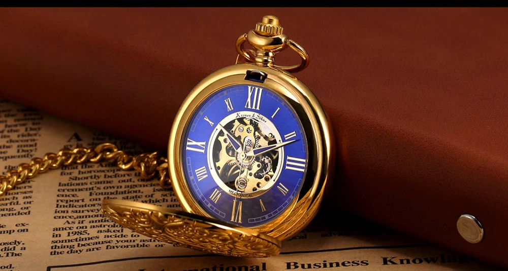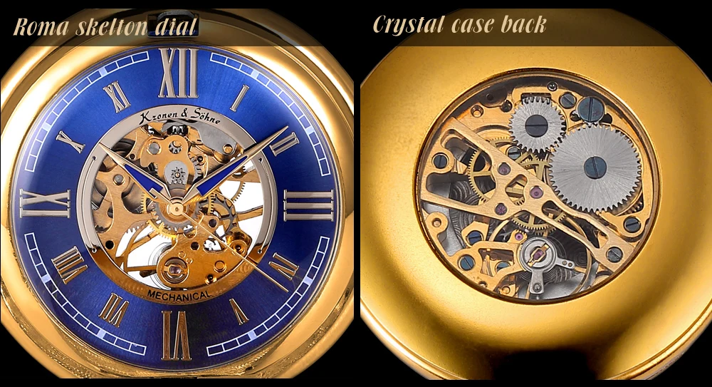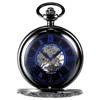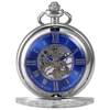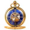 KS Golden Steampunk Roman Mechanical Blue Pocket Watch Hand Winding Men Clock Fobs Long Chain Key Pendant Watches + Box /KSP073