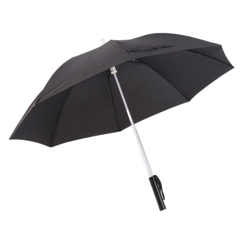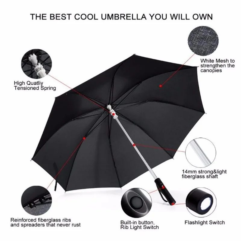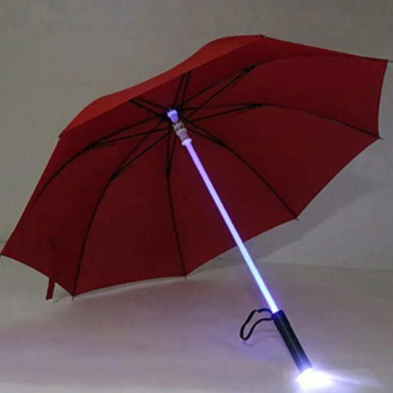 The Led Lightsaber Umbrella has a LED lighting in the rod that only needs three AAA batteries to get the job done. It may light in seven colors, such as red, blue, green, and purple. There is also a flashlight choice, which means you will definitely be light up the nighttime skies.