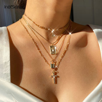 IngeSight.Z 4Pcs/Set Multi Layer Crystal Cross Letter A Choker Necklace Padlock Carved Coin Rhinestone Pendant Necklaces Jewelry
