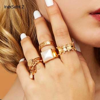IngeSight.Z 5Pcs/Set Charm Geometric Square Resin Rings Punk Gold Color Sequins Tassel Knuckle Finger Rings for Women Jewelry